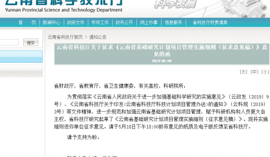 云南省科技厅关于征求《云南省基础研究计划项目管理实施细则(征求意见稿)》意见的函