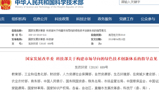 国家发展改革委 科技部关于构建市场导向的绿色技术创新体系的指导意见