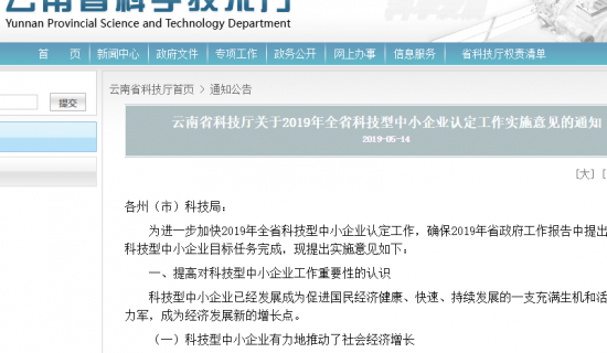 云南省科技厅关于2019年全省科技型中小企业认定工作实施意见的通知