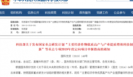 科技部关于发布国家重点研发计划“主要经济作物优质高产与产业提质增效科技创新”等重点专项2019年度定向项目申报指南的通知