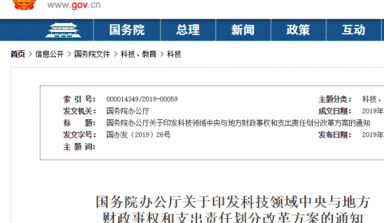 国务院办公厅关于印发科技领域中央与地方 财政事权和支出责任划分改革方案的通知 国办发〔2019〕26号