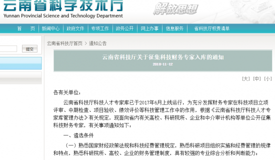 云南省科技厅关于征集科技财务专家入库的通知