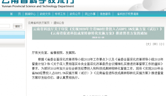 云南省科技厅关于印发《实现2020年全省R&D经费投入占GDP2.5%实施方案(试行)》《云南省促进科技成果转移转化实施方案》推进督查方案的通知