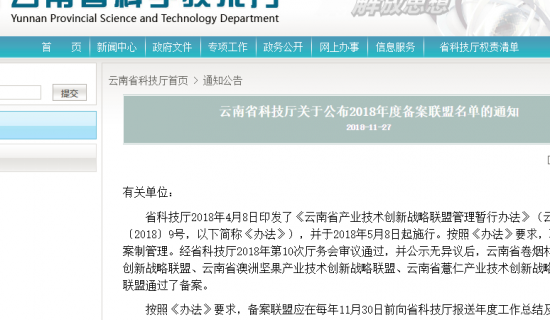 云南省科技厅关于公布2018年度备案联盟名单的通知