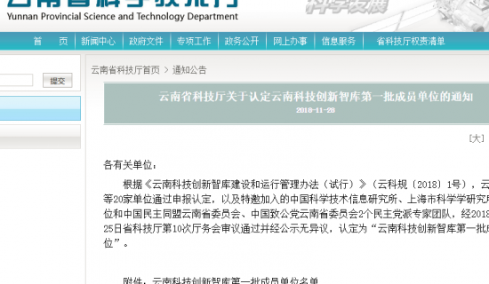 云南省科技厅关于认定云南科技创新智库第一批成员单位的通知