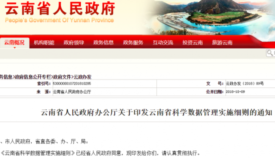 云南省人民政府办公厅关于印发云南省科学数据管理实施细则的通知