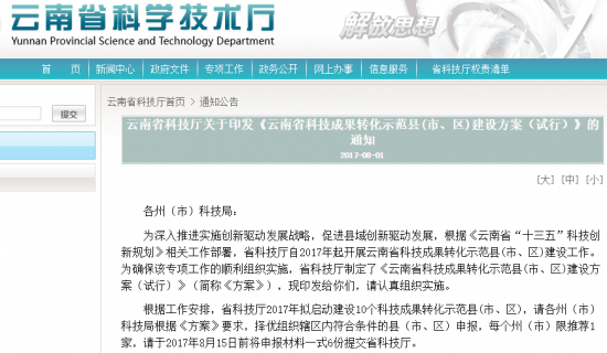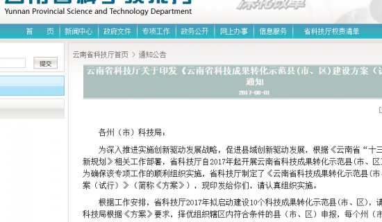 云南省科技成果转化示范县(市、区) 建设方案(试行)