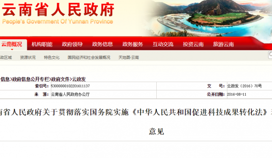 云南省人民政府关于《贯彻落实国务院实施<中华人民共和国促进科技成果转化法>若干规定的实施意见》