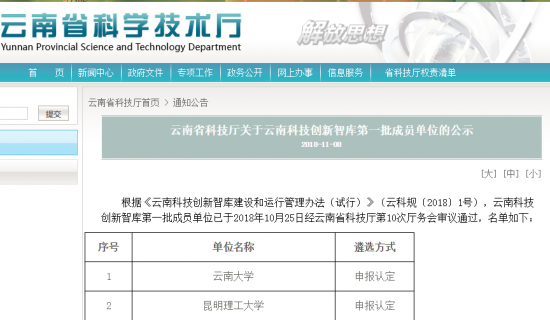 云南省科技厅关于云南科技创新智库第一批成员单位的公示