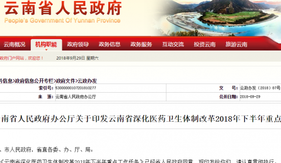 云南省人民政府办公厅关于印发云南省深化医药卫生体制改革2018年下半年重点工作任务的通知