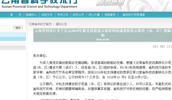 云南省科技厅关于公示2018年拟支持建设云南省科技成果转化示范县(市、区)的通知
