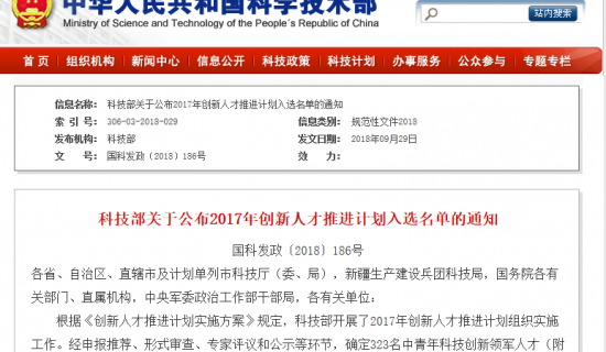 科技部关于公布2017年创新人才推进计划入选名单的通知