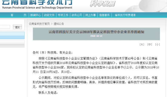 云南省科技厅关于公示2018年拟认定科技型中小企业名单的通知